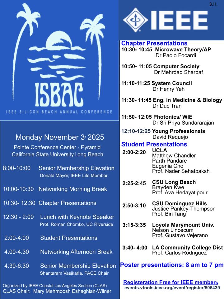 IEEE Silicon Beach Annual Conference (ISBAC) will be held this year on Monday November 3, 2025, at the Pointe Conference Center of the Walter Pyramid at California State University Long Beach. The conference will consist of a series of presentations by the technical chapters, affinity groups, and student chapters. Additionally, there will be poster presentations as well as two IEEE Senior Membership Elevation sessions. Registration for all IEEE members will be free and will include passes to all sessions including two networking breaks and the Keynote session with Lunch.